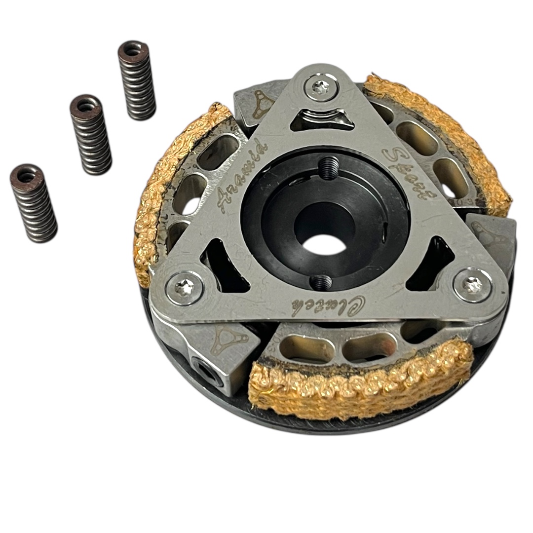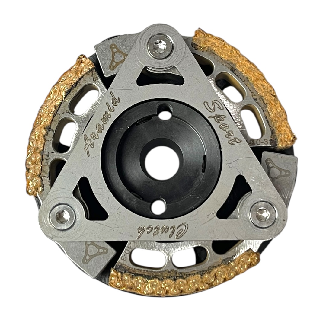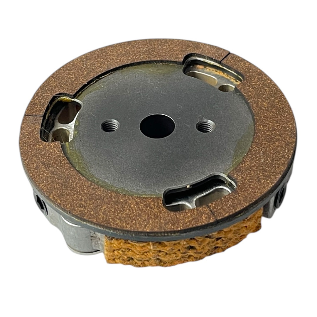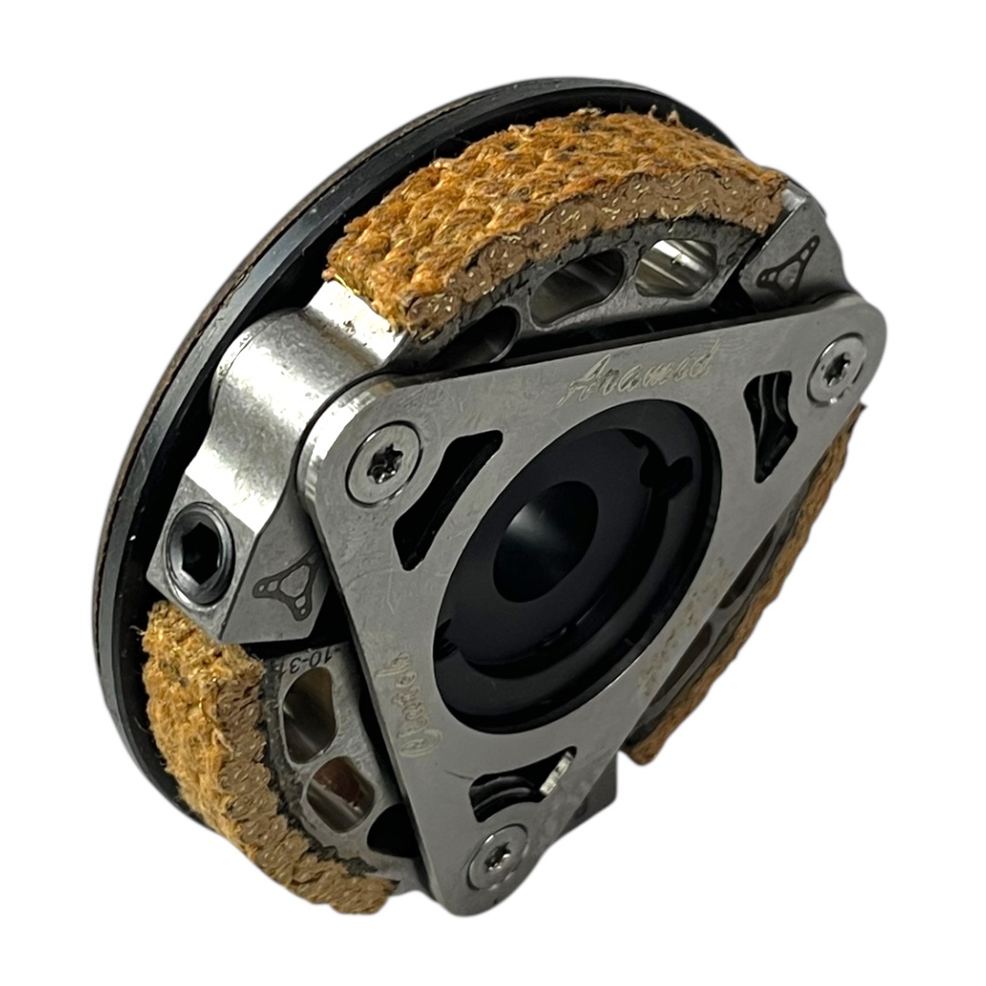 Diese Kupplung verwendet keine Sicherungsringe, sondern zwei 1,5 mm dicke Unterlegscheiben, unterhalb und oberhalb der Kupplungsbacke. Danach wird die Verstärkungsplatte mit vollständig versenkten Torx Senkschrauben installiert. Dadurch wird die gesamte Kupplung etwa 1 mm dünner, was das Problem lösen sollte, dass Verstärkungsplatten manchmal die Kupplungsglocken berührten!