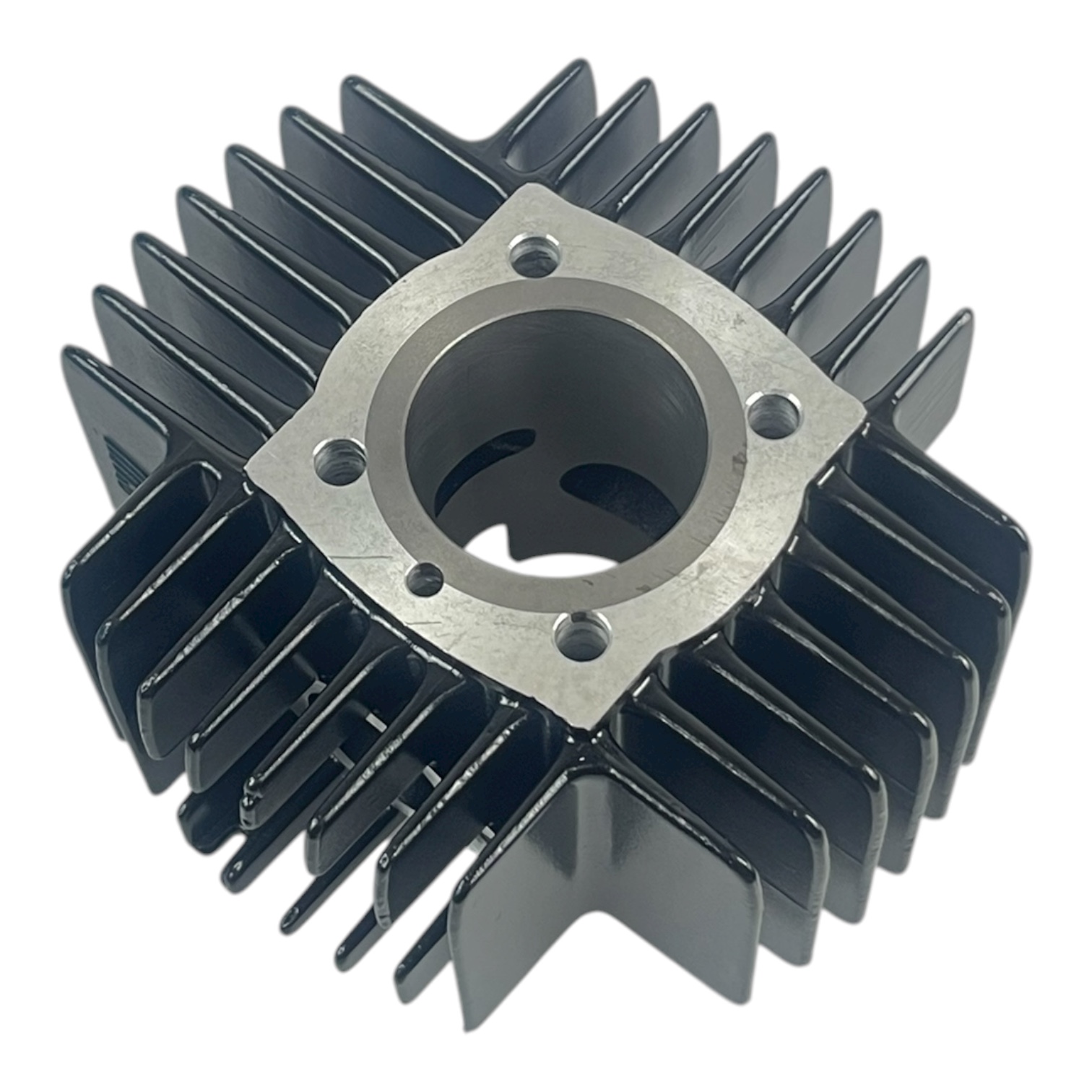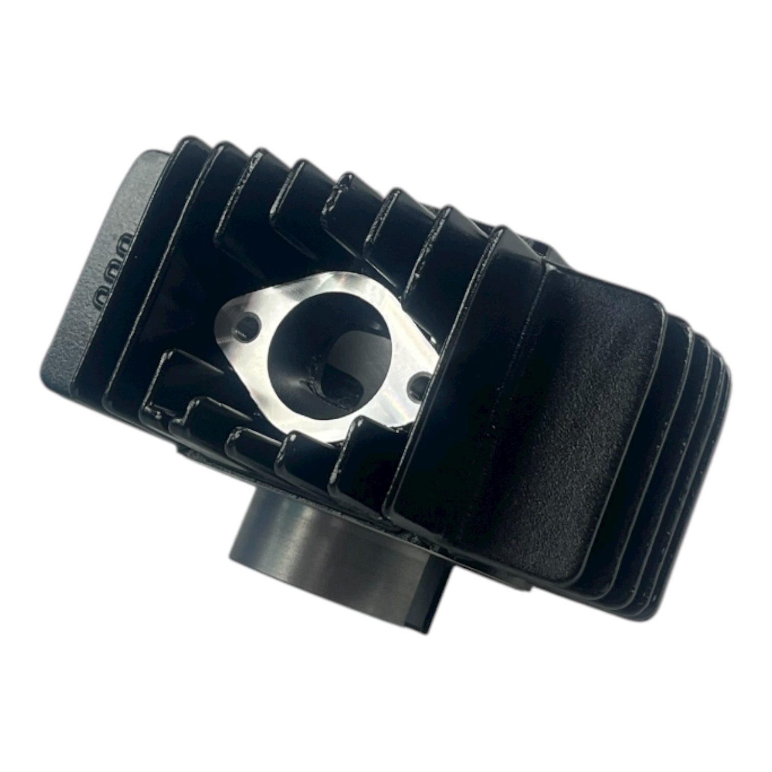 Der Aluminiumzylinder mit Grauguss-Laufbüchse ist ein optimierter Nachbau des originalen Metrakit-Racingzylinders. Die Steuerzeiten wurden im Vergleich zum Original überarbeitet und mit mehr Vorauslass versehen, wodurch das bekannte Kolbenklemmer-Problem aufgrund hoher Hitzeentwicklung der Vergangenheit angehört. Zudem wurde die Zylinderhöhe präzise angepasst, sodass die früher notwendige extradicke Fussdichtung nun überflüssig ist.