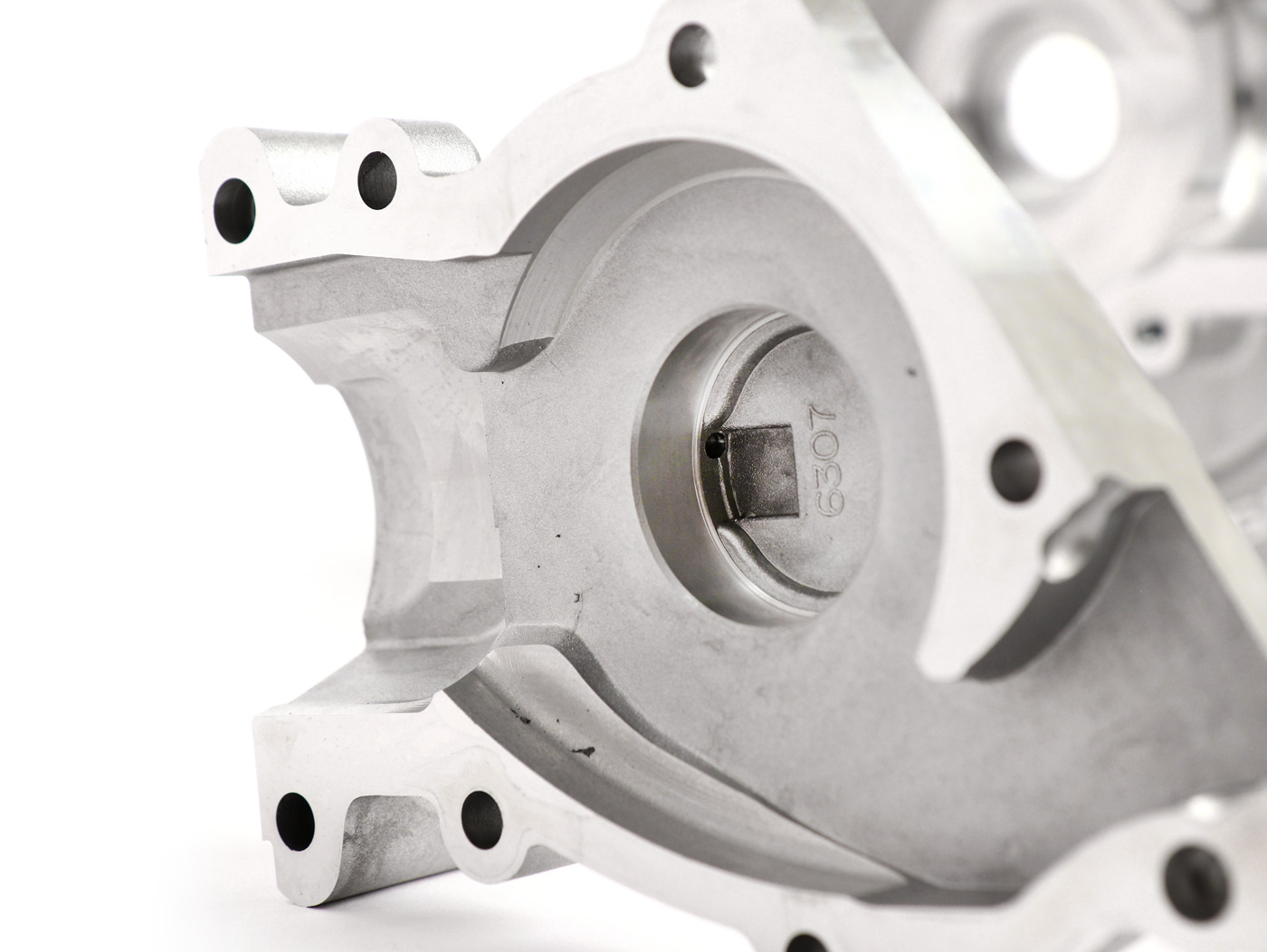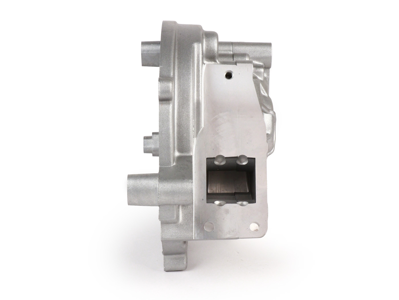 Druckgegossenes, kugelgestrahltes Kurbelgehäuse aus einer Aluminium-Silizium-Legierung.