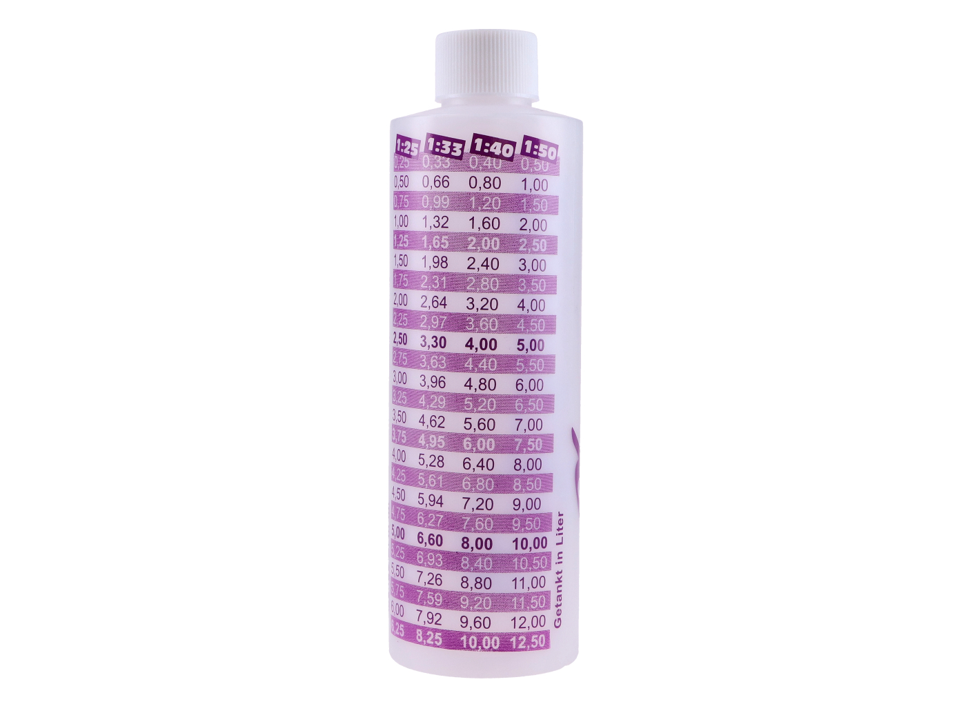 Die Flasche fasst 250ml 2-Takt Mischöl eurer Wahl und ist mit den Mischverhältnissen 1:25, 1:33, 1:40: 1:50 bedruckt. Je nach Mischverhältnis sind die Ölmengen für 0,25 Liter bis 12 Liter Benzin abgebildet, natürlich sinnhaft „aufsteigend“ trotz abnehmender Ölmenge da die Skala die ausgegossene Menge Öl anzeigt.