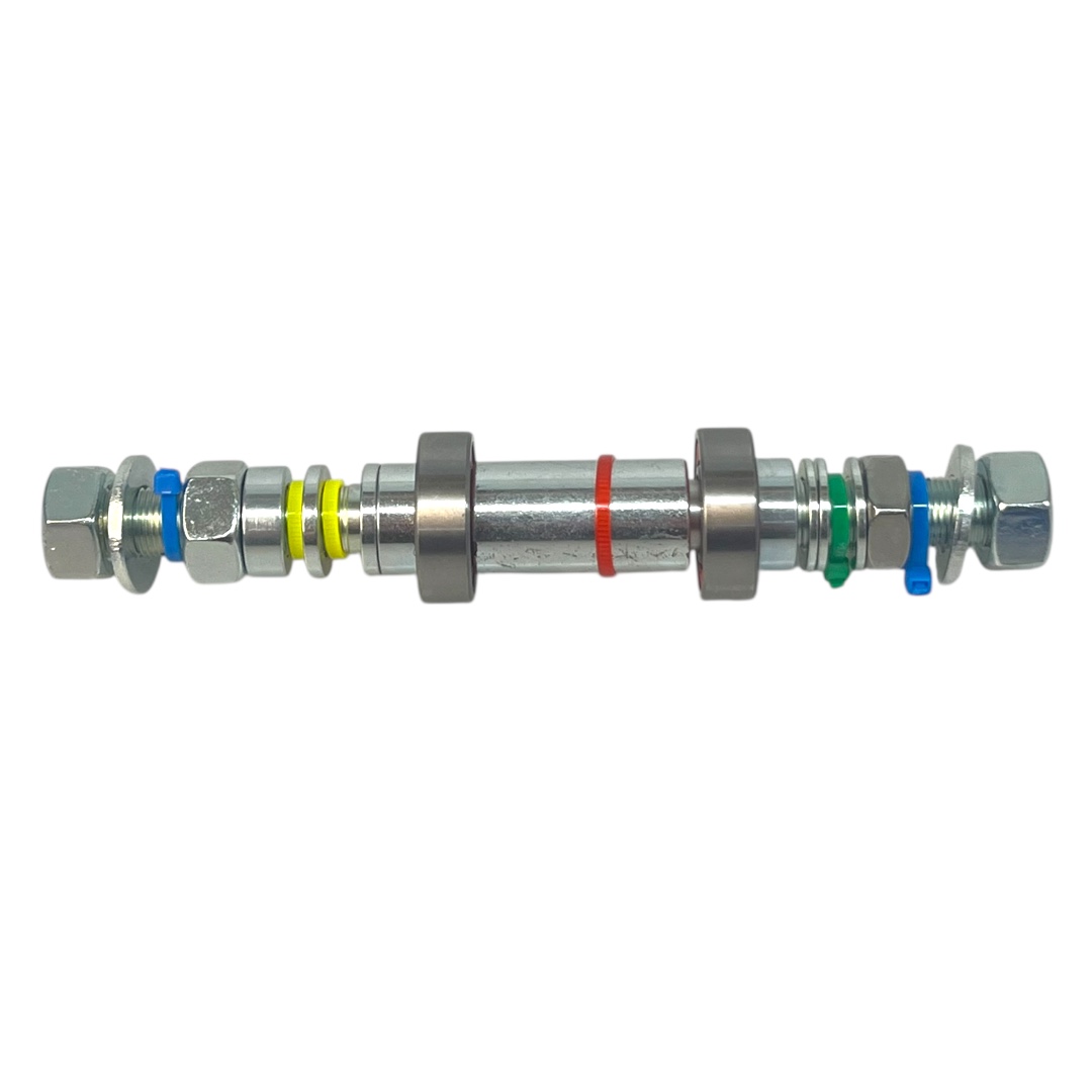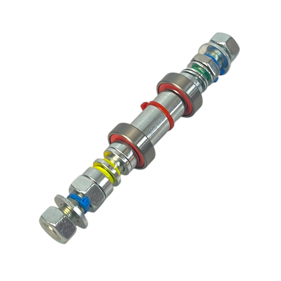 Das Set besteht aus einer 165 mm langen Radachse, zwei speziellen Kugellagernund allen benötigten Muttern und Distanzscheiben.