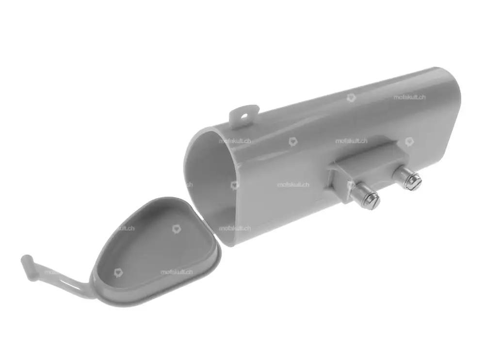 Graue Werkzeugtrommel umgangssprachlich Werkzeugbehälter für Puch X30 Velux Mofas.